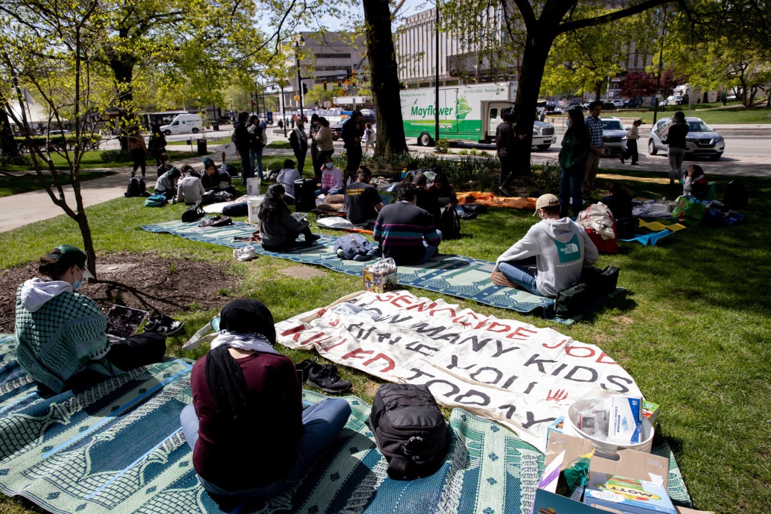Protestors participate in an encampment for Palestine outside the Cathedral of Learning on the University of Pittsburgh campus in Oakland on Tuesday, April 23, 2024. (Photo by Pamela Smith/PublicSource)