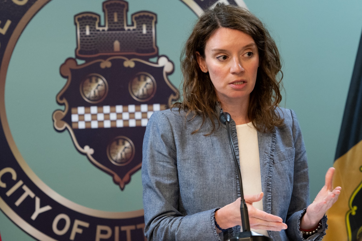 Pittsburgh Controller Rachael Heisler discusses the city’s budget during a press conference in her Downtown office on Wednesday, May 1, 2024. (Photo by Pamela Smith/PublicSource).