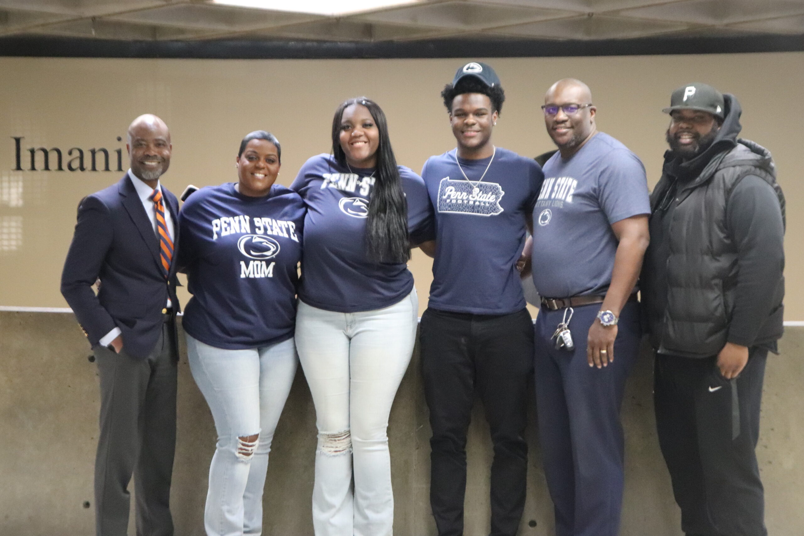 IMANI CHRISTIAN ACADEMY HIGH SCHOOL JUNIOR DAYSHAUN BURNETT, WITH HIS FAMILY, HEAD COACH AND IMANI CHRISTIAN OFFICIALS, FEB. 7. BURNETT, THIRD FROM RIGHT, MADE HIS DECISION TO PLAY FOOTBALL AT PENN STATE IN 2025. BURNETT IS EXPECTED TO PLAY LINEBACKER AND DEFENSIVE END AT PENN STATE.