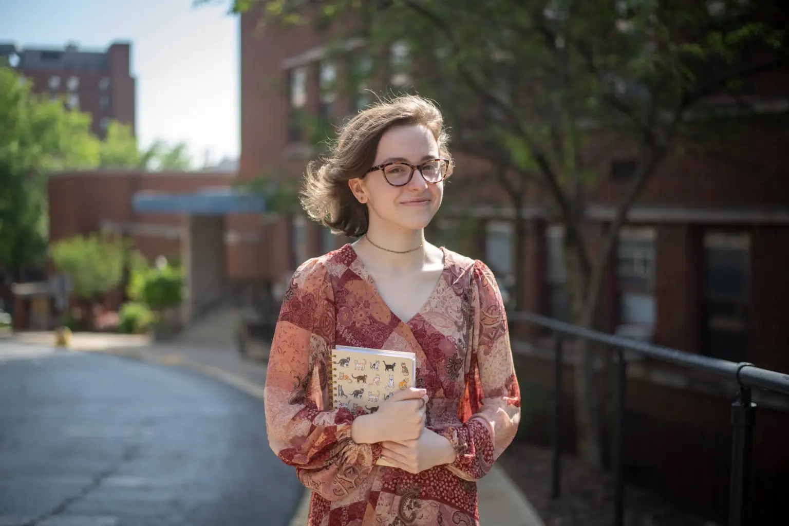 Jane Windsheimer stands for a portrait at Carlow University, Wednesday, May 22, 2024, in Oakland, holding a journal. (Photo by Stephanie Strasburg/PublicSource)