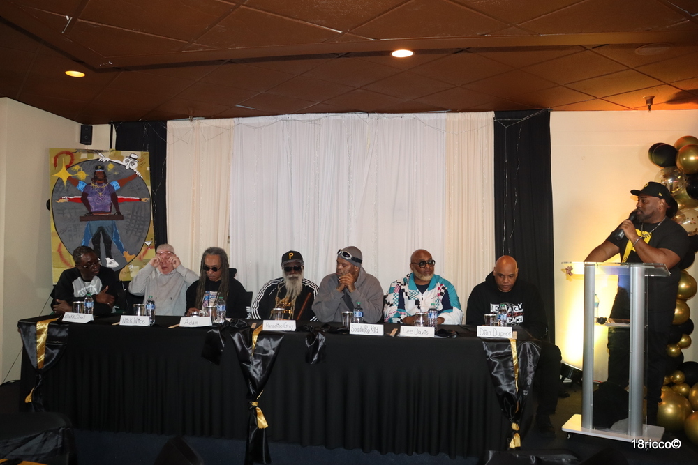 MARLON HEYWOOD PUT TOGETHER THE HOT METAL MICS PITTSBURGH LEGENDS PANEL DISCUSSION ON APRIL 7 IN PENN HILLS. FROM LEFT ARE DJ BLAKK STEEL, DJ NICK NICE, ADAM SMITH, PARADISE GRAY, SODA POP KID, LEE DAVIS, DION DUPREE AND MARLON HEYWOOD. (PHOTOS BY J.L. MARTELLO)