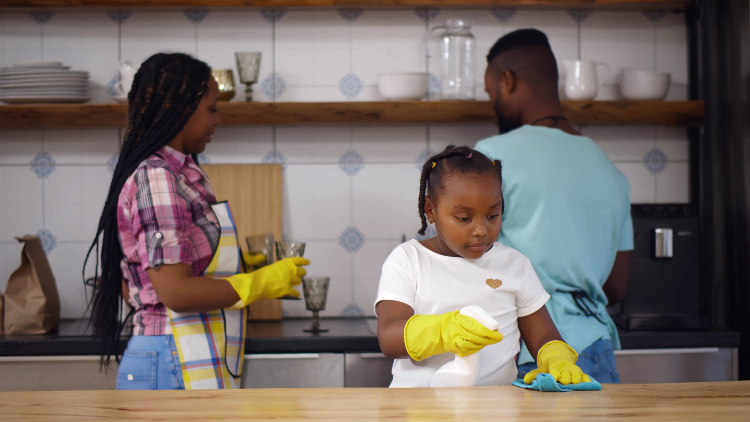 Happy afro-american family doing cleaning at kitchen together. Cute preteen african daughter wiping table with sprayer and cloth while parents washing dishes on background