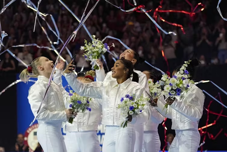 The U.S. gymnastics team selected for the 2024 Paris Olympics celebrates in Minneapolis. AP Photo/Abbie Parr