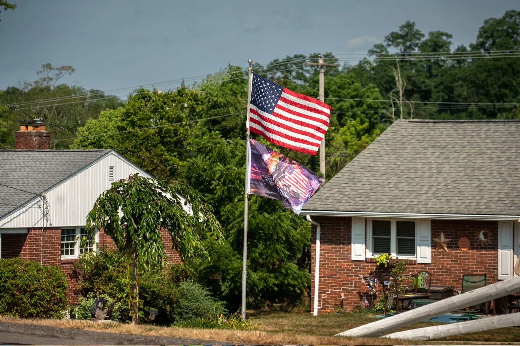 A flag with an illustration of former President Donald Trump standing on an army tank flies in a yard along Milford Drive, the street on which Thomas Matthew Crooks lived, on Tuesday, July 16, 2024, in Bethel Park. Crooks, 20, is the alleged shooter in an assassination attempt during a Butler campaign rally for former President Donald Trump. (Photo by Stephanie Strasburg/PublicSource)