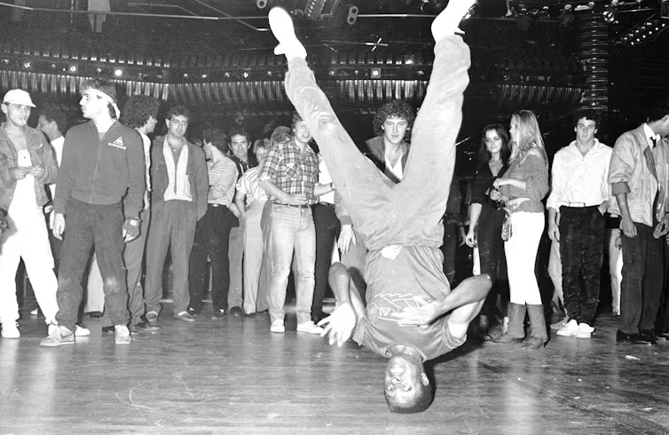 A breaker pulls off a headspin at a nightclub in the late 1980s. Dave Hogan/Hulton Archive via Getty Images