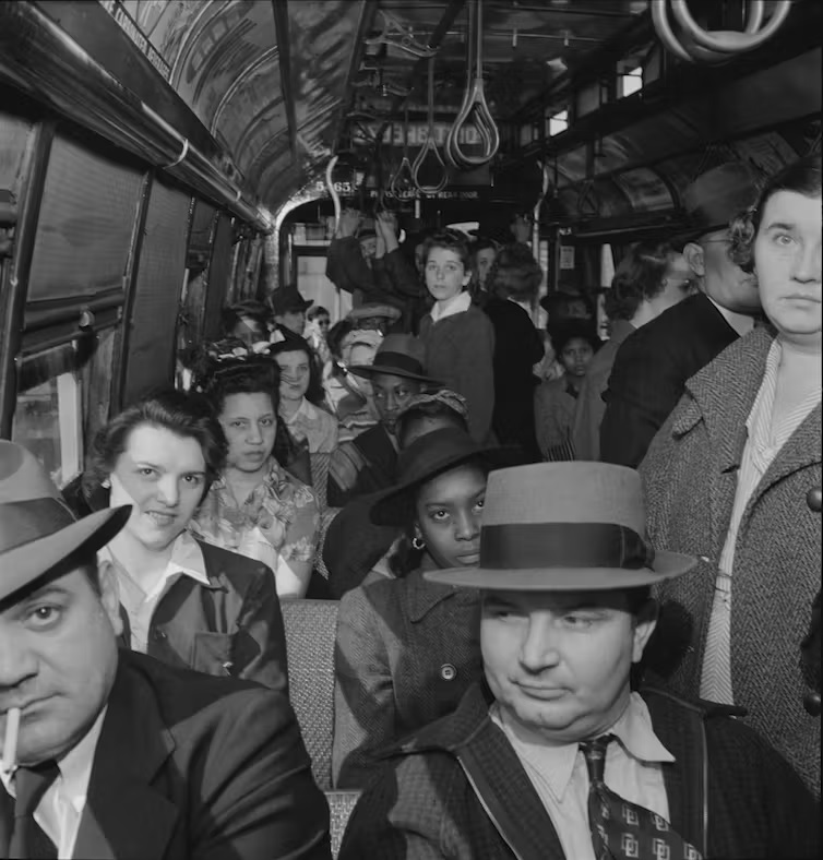 Workers on a trolley at 5 p.m. in Baltimore, April 1943. Marjory Collins/Library of Congress, CC BY-ND