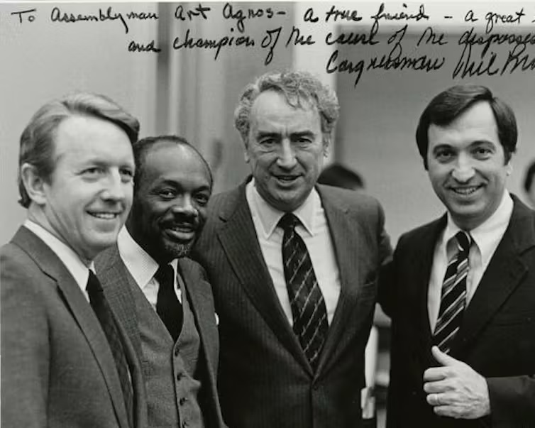 California Democratic Congressman Phil Burton, second from right, with – left to right – Democratic State Assemblymen Leo T. McCarthy, Willie L. Brown and Art Agnos, in the early 1980s. San Francisco History Center, San Francisco Public Library