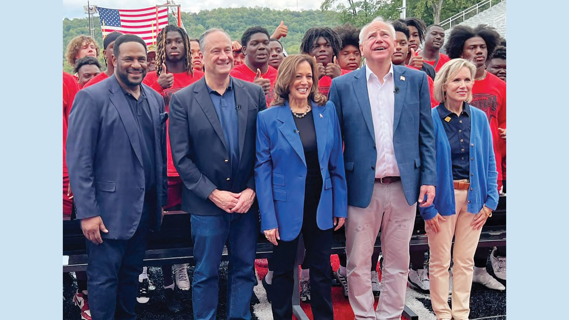 THE ALIQUIPPA FOOTBALL TEAM WITH JEROME BETTIS, SECOND GENTLEMAN DOUG EMHOFF, VICE PRESIDENT KAMALA HARRIS, MINNESOTA GOVERNOR TIM WALZ AND HIS WIFE, GLEN WALZ. (PHOTO COURTESY PHILLIP K. WOODS/ALIQUIPPA)