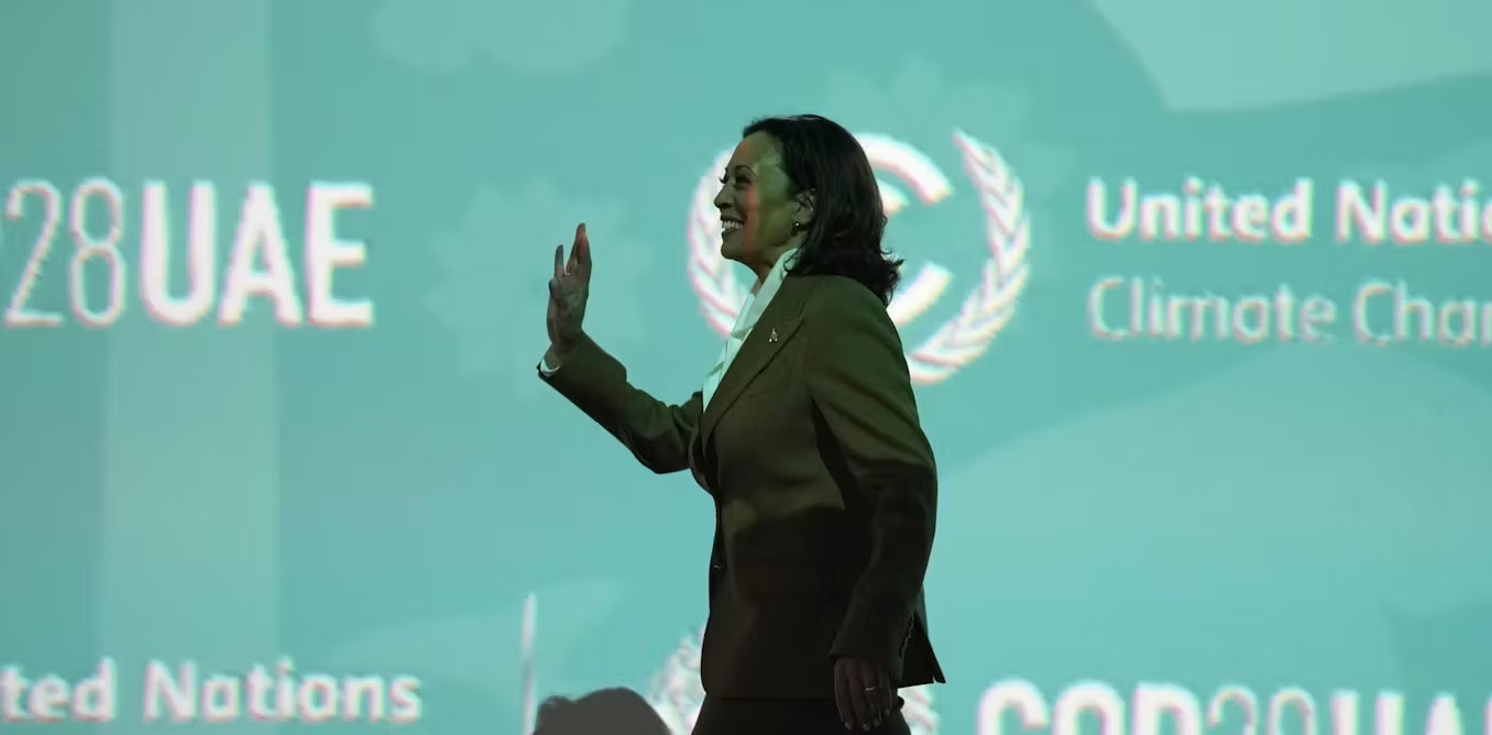 Vice President Kamala Harris arrives to speak at the COP28 UN Climate Summit in December 2023. in Dubai, United Arab Emirates. Since she began her run for president, her climate stances have been shrouded in what is likely deliberate ambiguity. (AP Photo/Kamran Jebreili)