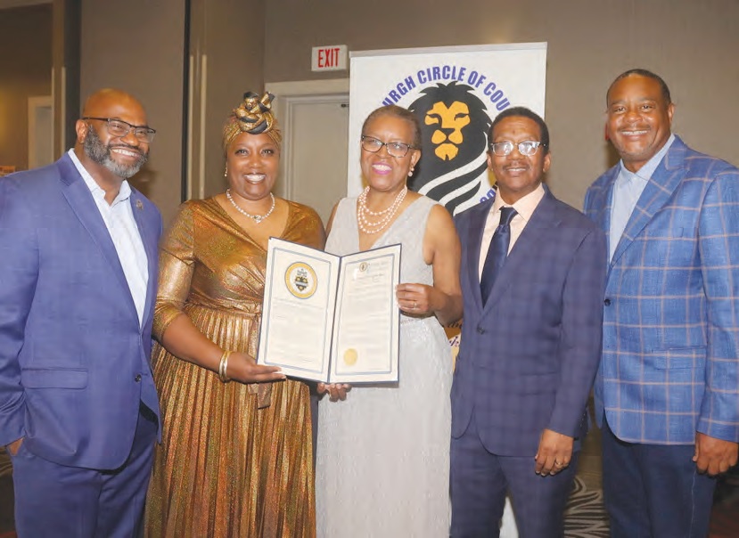 THE BYNUMS RECEIVED A PROCLAMATION FROM THE OFFICE OF PITTSBURGH MAYOR ED GAINEY, DURING THE CIRCLE OF COURAGE AWARDS, AUG. 16, AT THE DOUBLE TREE HOTEL IN GREEN TREE. PICTURED ARE RICK WILLIAMS, REV. AISHA TATE, KATHY BYNUM, RUSSELL BYNUM AND MAYOR ED GAINEY. (PHOTO BY J.L. MARTELLO)