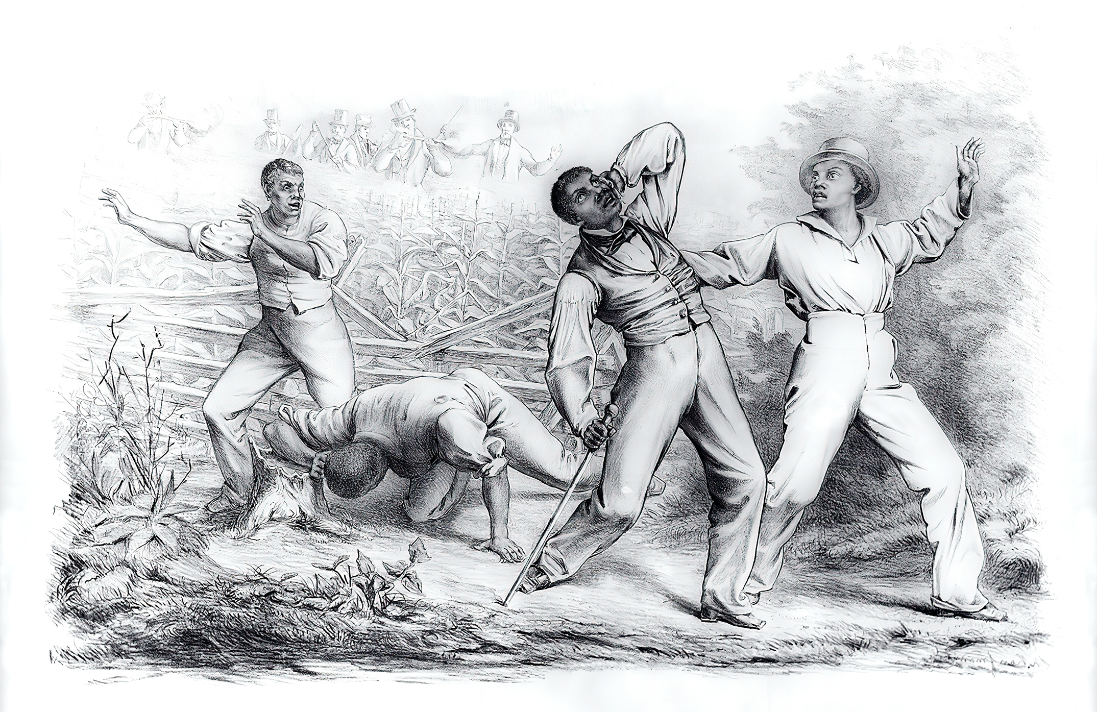 Vintage illustration shows a group of four black men, possibly freedmen, ambushed by a posse of six armed whites in a cornfield. The Fugitive Slave Act passed by Congress in September 1850 allowed slave-hunters to seize alleged fugitive slaves without due process of law and prohibited anyone from aiding escaped fugitives or obstructing their recovery. The law threatened the safety of all blacks, slave and free, and forced many Northerners to become more defiant in their support of fugitives.