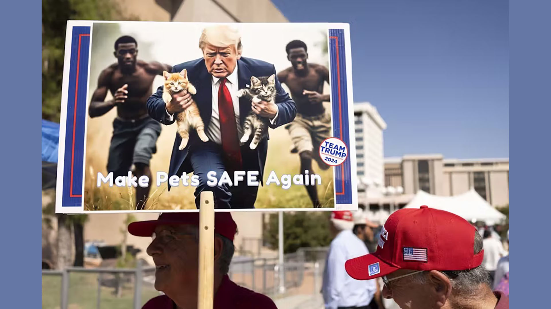 A man in Tucson, Arizona, carries an AI-generated image referencing falsehoods spread by Donald Trump and his running mate about Haitian migrants in Springfield, Ohio. Rebecca Noble/AFP via Getty Images