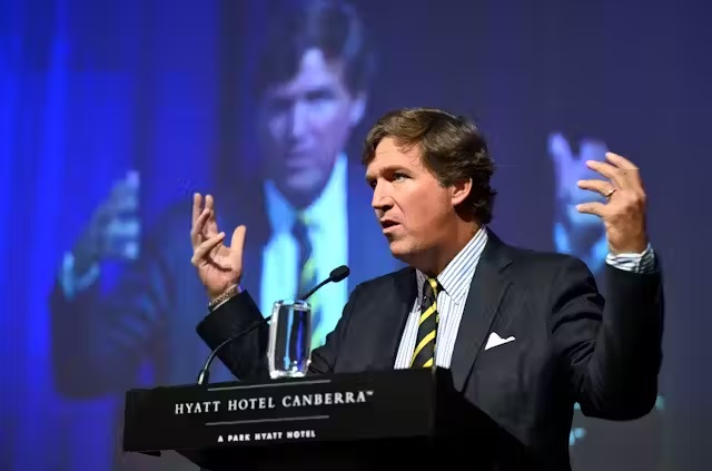 Tucker Carlson speaking at the Australian Freedom Conference, Hyatt Hotel, Canberra, June 25, 2024. Lucas Koch/AAP