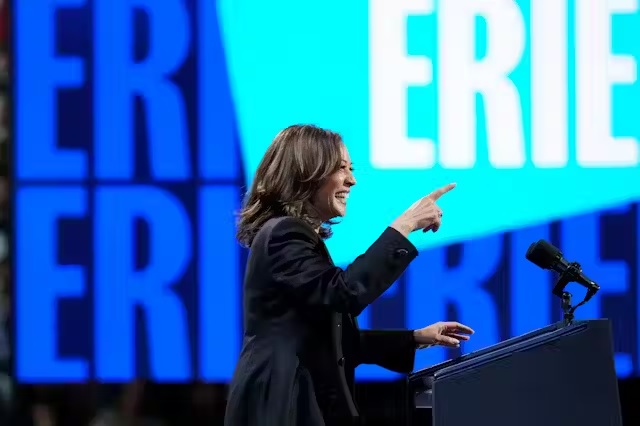 Democratic presidential nominee Vice President Kamala Harris speaks during a campaign rally at Erie Insurance Arena, in Erie, Pa., Oct. 14, 2024. (AP Photo/Jacquelyn Martin)