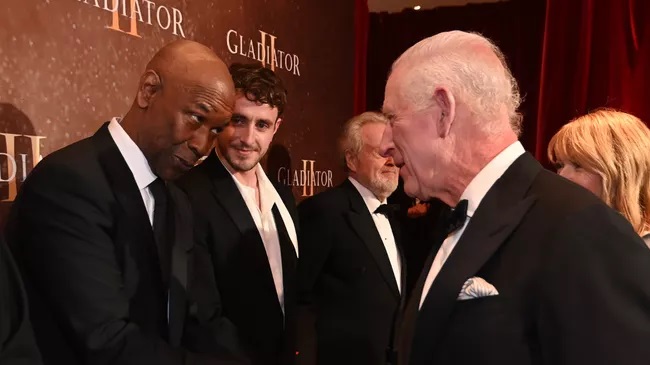 Washington was joined by his costars, Paul Mescal, Pedro Pascal, Connie Nielsen, and director Sir Ridley Scott, all of whom formed a line on the carpet to be greeted by Charles.