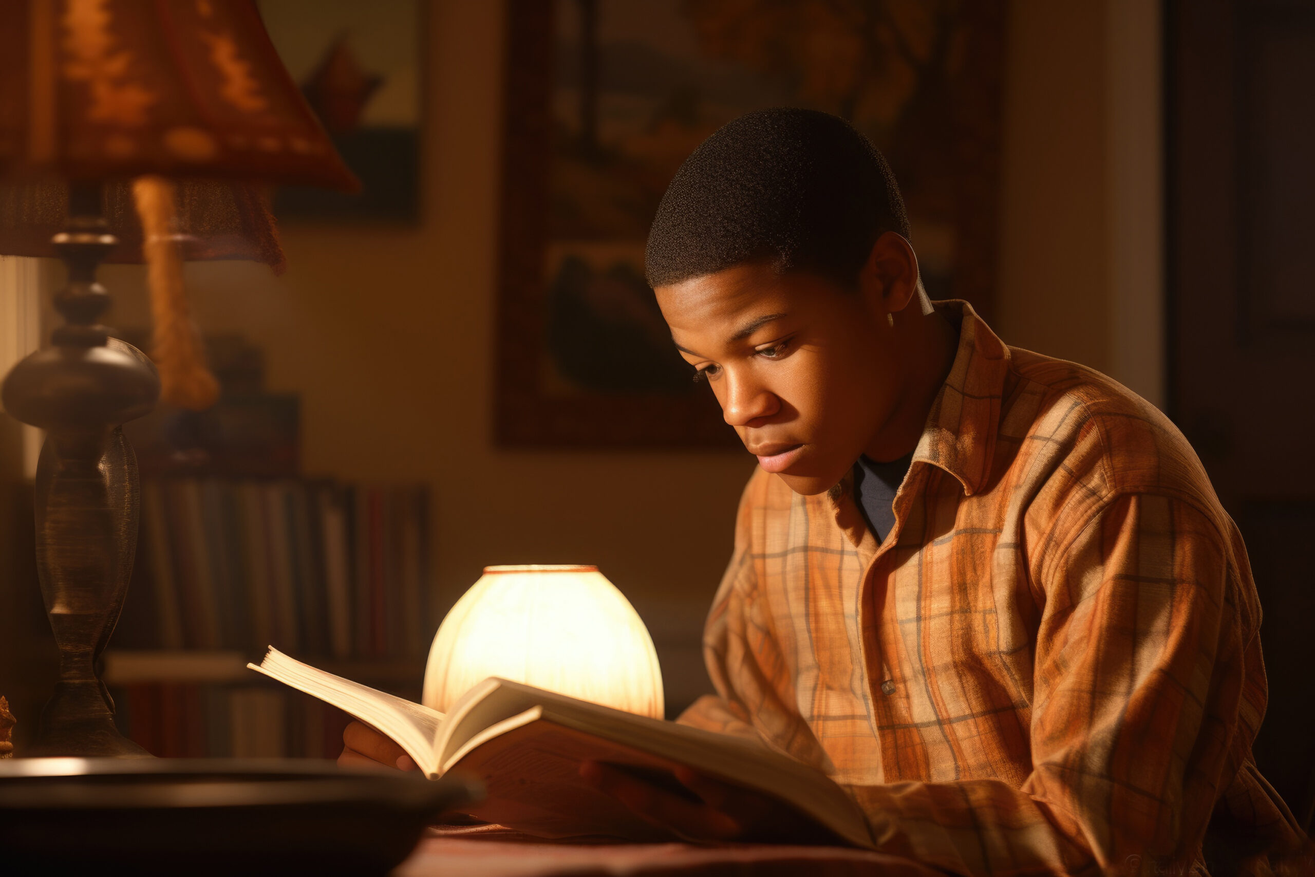 Male African American teenager reading books in home library casual relaxing. Generative AI AIG23.