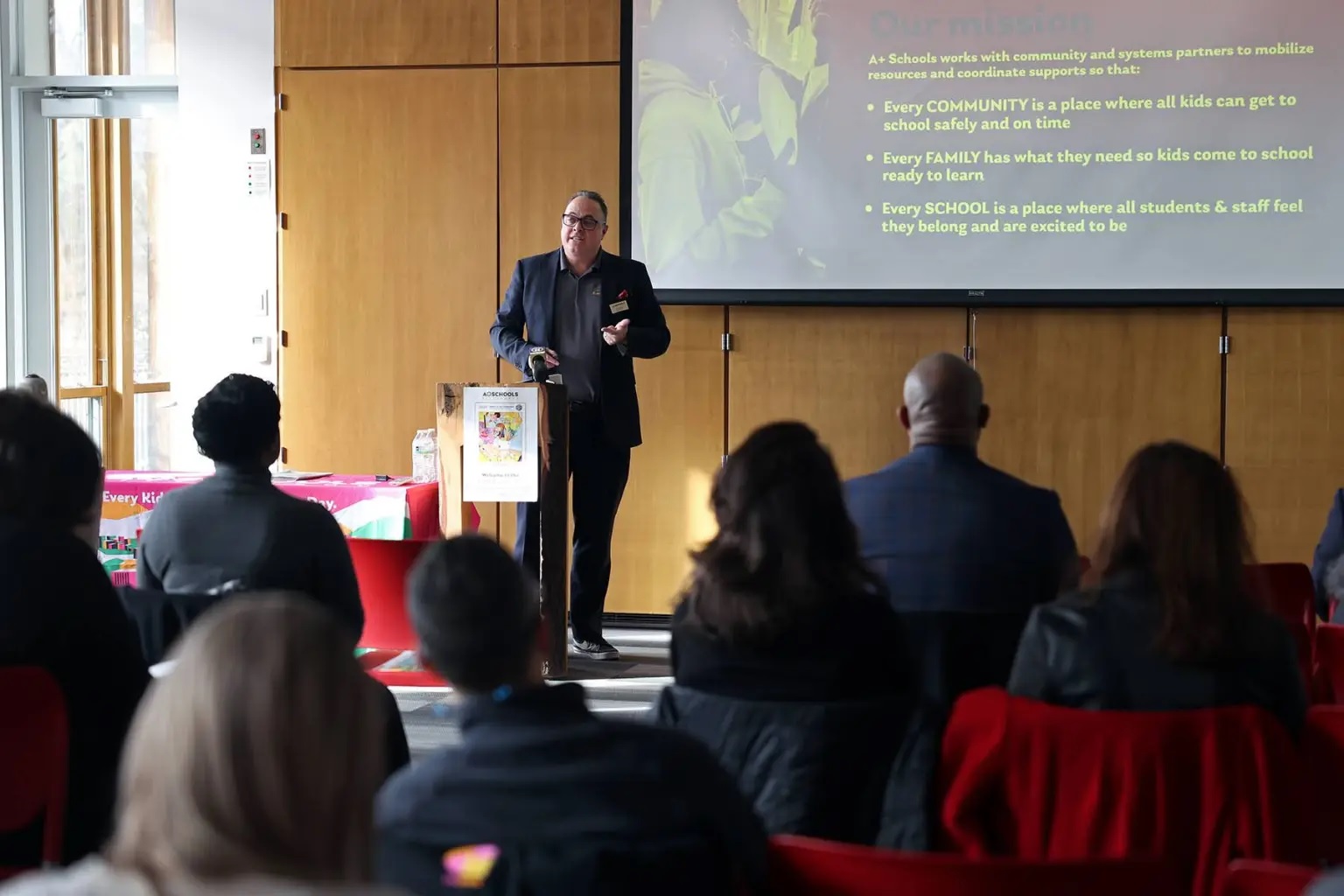 James Fogarty, executive director of A+ Schools, presents the group’s annual Report to the Community on Monday, Dec. 2, 2024, at Frick Educational Center in Squirrel Hill South. Fogarty cited chronic absenteeism rate as a key factor affecting a school’s success. (Photo by Anastasia Busby/PublicSource)