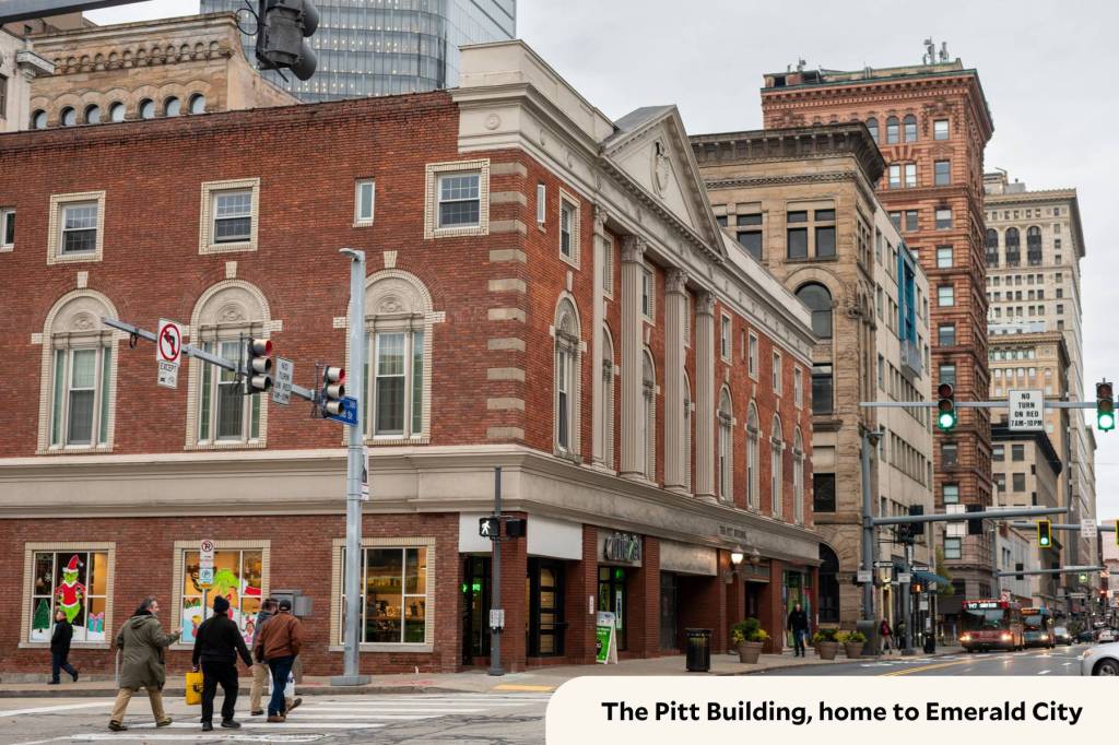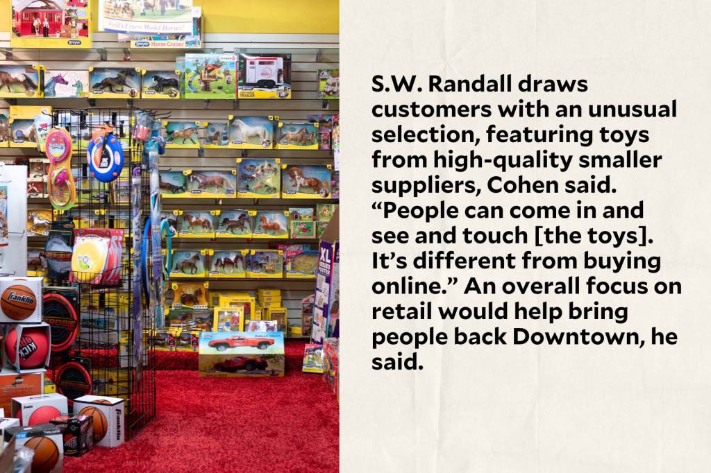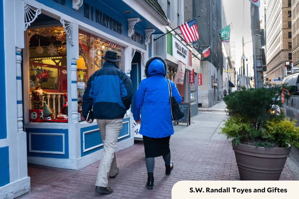 Situated at opposing ends of Smithfield Street, S.W. Randall Toyes & Giftes and the Emerald City coworking space represent two keys for the Downtown thoroughfare: active retail space and creative reuse of landmark buildings. (Photos by Stephanie Strasburg/PublicSource)