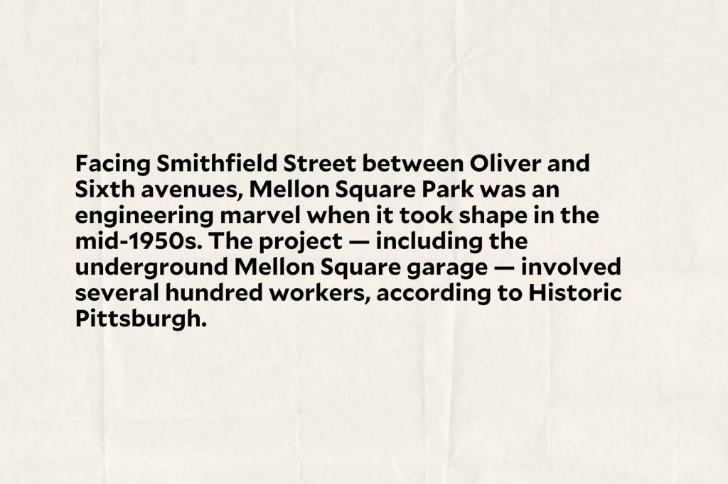 Together, the changes should improve visits for everyone who uses Smithfield, especially walkers, Panzitta said. Part of the approach should lead people into Mellon Square Park, a historical plaza built in 1955 atop the Mellon Square parking garage between Oliver and Sixth avenues.