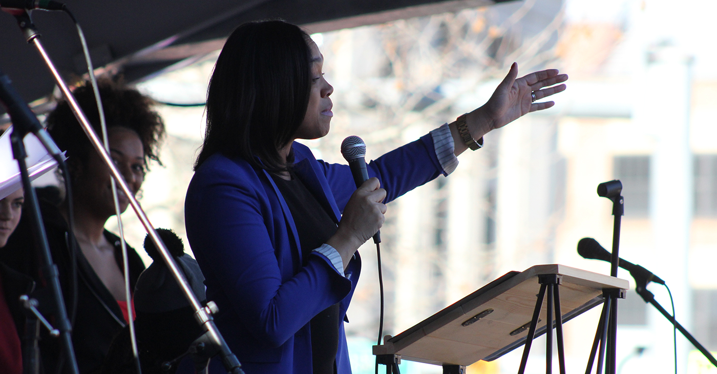 Former Baltimore State’s Attorney Marilyn Mosby speaks at the Baltimore Women’s March Gathering Rally at War Memorial Plaza at 101 North Gay Street in Baltimore, MD, January 20, 2018. Photo by Elvert Barnes Protest Photography / Wikimedia Commons.