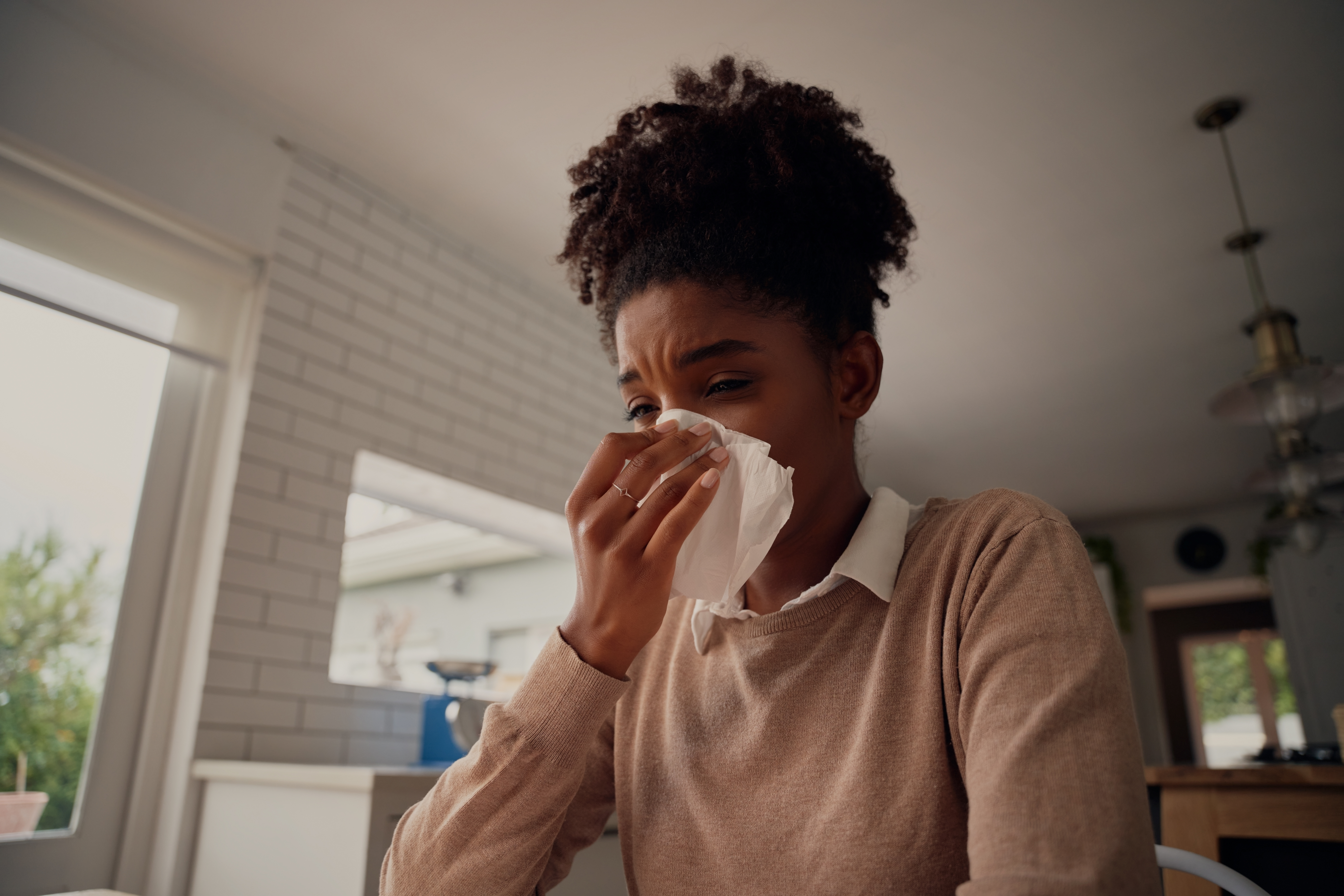 Ill sick african american woman blowing running nose with the flu caught cold sneezing in tissue - working from home sick