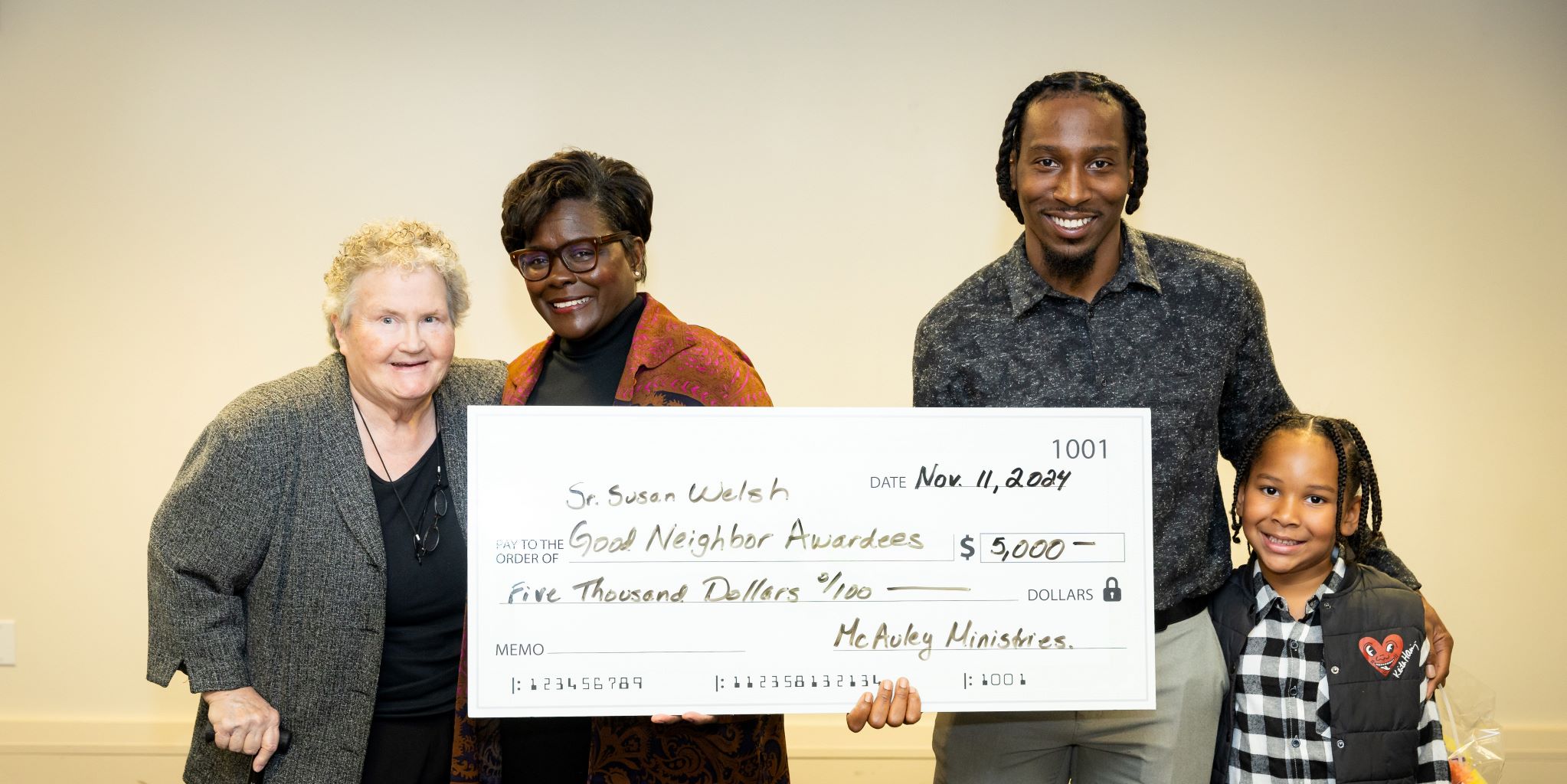 SAUNTEE TURNER, SECOND FROM LEFT, AND JORDAN MORRIS, SECOND FROM RIGHT, RECEIVE THE SISTER SUSAN WELSH GOOD NEIGHBOR AWARD FOR 2024, FROM MCAULEY MINISTRIES.