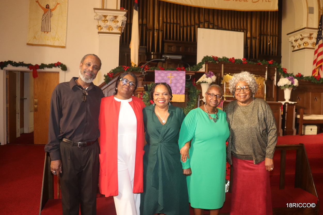 WILL BOXLEY, DELPHINE KELLY, LOUISE HARRIS, BARBARA PERRY, AND JANETTE EVANS. ALL THE SINGERS AT THE GREATER ALLEN AME CHURCH HOLIDAY CONCERT, DECEMBER 14. (PHOTOS BY J.L. MARTELLO)