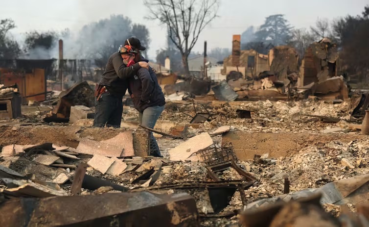 Two people embrace on Jan. 9, 2025, in Altadena, Calif., amid property destroyed by the Eaton Fire. Justin Sullivan/Getty Images