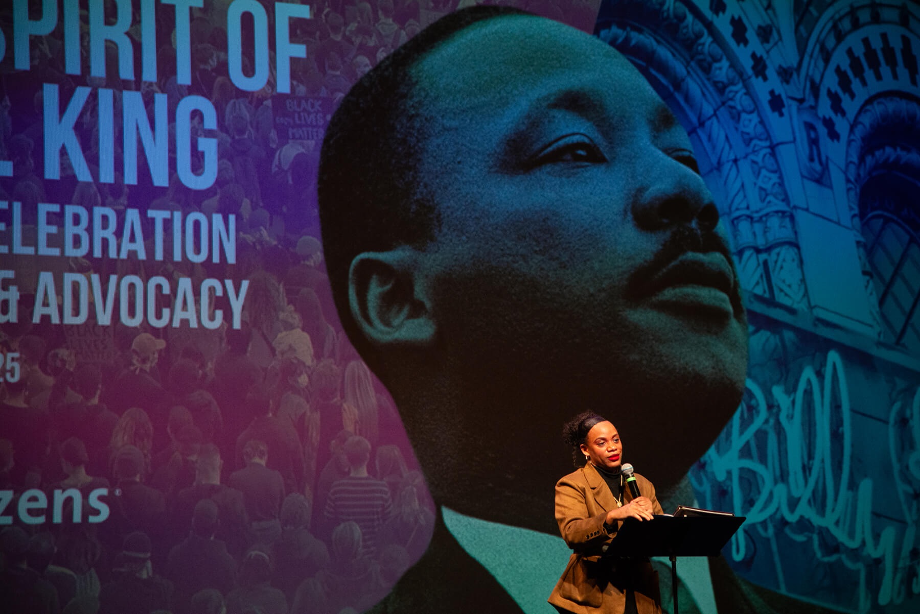 Allegheny County Executive Sara Innamorato at an MLK Day Celebration at the Kelly Strayhorn Theater on Jan. 20. (Photo by Amaya Lobato Rivas/PublicSource).