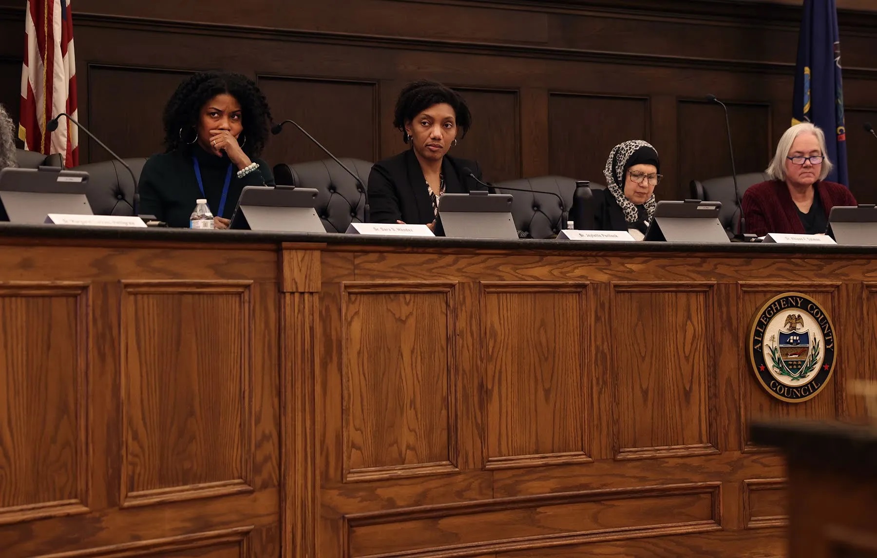 From left, Dr. Dara D. Méndez, Dr. Joylette Portlock, Dr. Khlood F. Salman and Lisa Scales listen to presentations during the first Allegheny County Board of Health meeting of the year on Wednesday, Jan. 15, 2025, at the Allegheny County Courthouse in Downtown. Portlock is now the only longtime member. (Photo by Anastasia Busby/PublicSource)