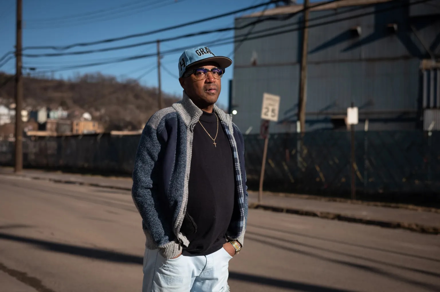 Isaac Bunn, 55, the descendant of Black steelworkers and founder of the Braddock Inclusion Project, a nonprofit focused on alleviating poverty, stands for a portrait by U.S. Steel’s Edgar Thomson Works, Thursday, Dec. 12, 2024, in Braddock. (Photo by Stephanie Strasburg/PublicSource)