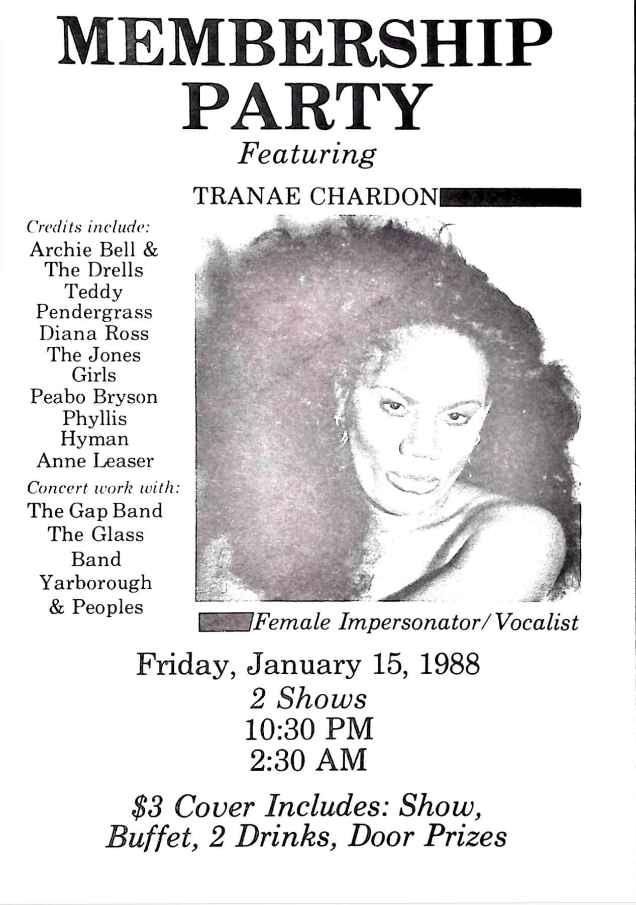 January 1988 Herron Social Club membership party flyer featuring performer Tranae Chardon. Owner Donny Thinnes changed the bar’s name to Donny’s Place in 1991. (Heinz History Center Detre Library and Archives)