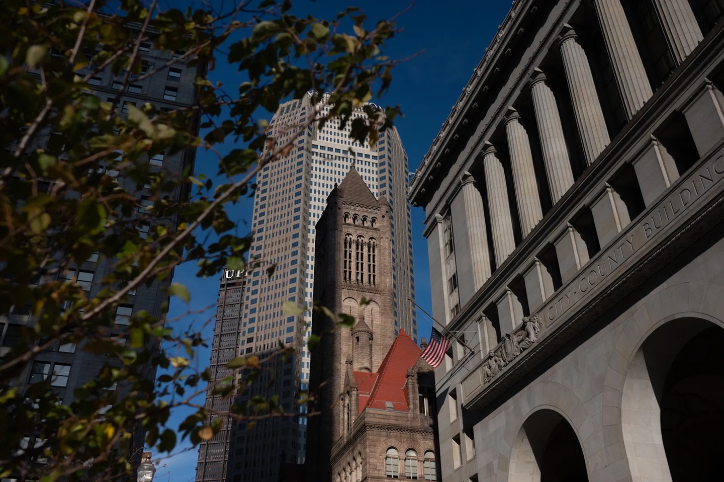 The Allegheny County Courthouse and the City-County Building on Monday, Nov. 6, 2023, in Downtown. (Photo by Stephanie Strasburg/PublicSource)