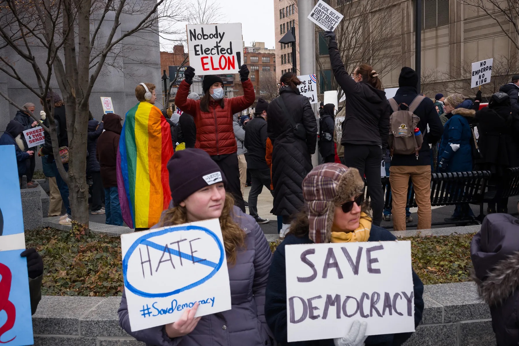 Scores of Pittsburghers gathered in front of the Federal Building, Downtown, on Wednesday to protest the early days of the second Trump administration, the influence of tech mogul billionaire Elon Musk, and the role of Pennsylvania’s U.S. Sen. John Fetterman, who has embraced parts of Trump’s agenda.