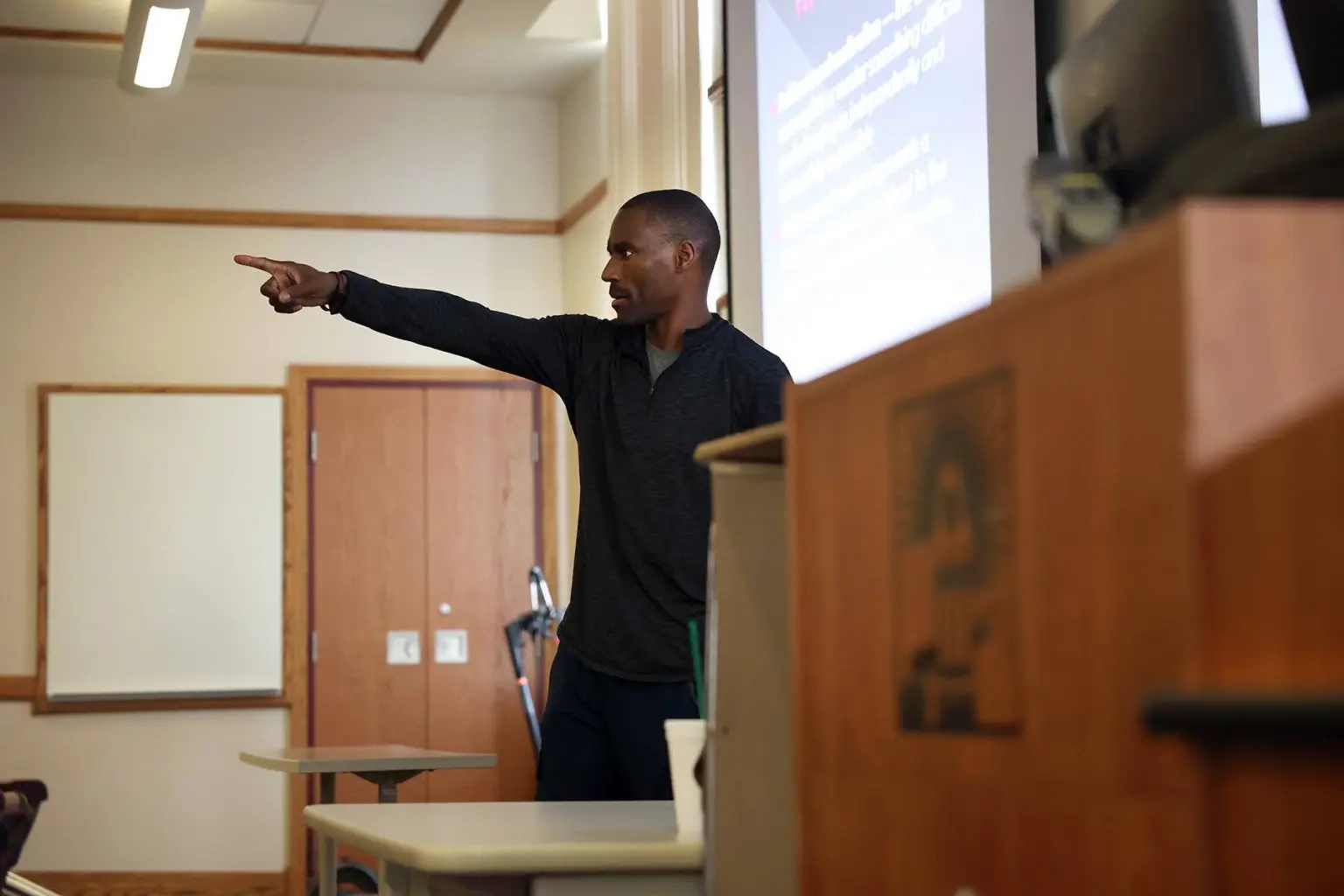 Dr. Rueben Brock calls on a student to speak on Wednesday, Feb. 26, 2025 at Pennsylvania Western University in California, Pennsylvania. (Photo by Anastasia Busby/PublicSource)