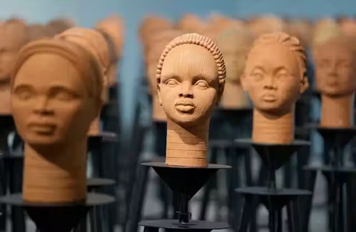 Sculptures created by French artist Prune Nourry representing missing girls from a school in Chibok, Nigeria, on display in Lagos in December 2022. (AP Photo/Sunday Alamba)
