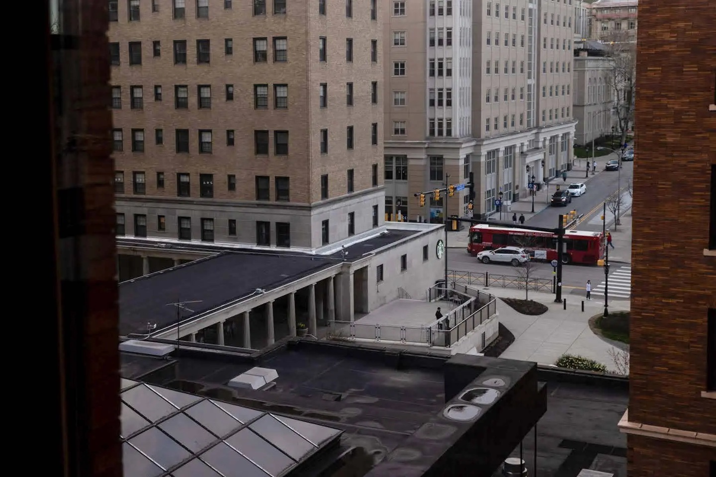 A bus drives by the University of Pittsburgh on Sunday, April 7, 2024. (Photo by Pamela Smith/PublicSource)