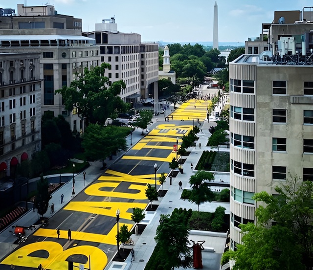 On June 5, 2020, the D.C. Department of Public Works painted the words “Black Lives Matter” in 35-foot-tall yellow capital letters.