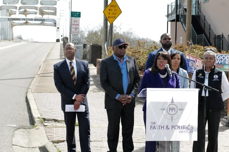The Edmund Pettus Bridge, a symbol of momentous change taking place in Alabama and a key symbol of American voting rights freedom. Rep. Terri Sewell (D-Ala.), Sen. Angela Alsobrooks (D-Md.), Rep. Jim Clyburn (D-S.C.), Rep. Byron Donalds (R-Fla.), and Virginia Lt. Gov. Winsome Earle-Sears participated in a press conference reflecting on the importance of Bloody Sunday to enabling voting rights for Black Americans. (Courtesy of Faith & Politics Institute)
