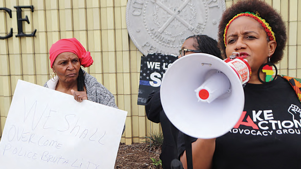 TAKE ACTION ADVOCACY GROUP CEO FAWN WALKER MONTGOMERY IS OUTRAGED AT THE RECENT EVENTS INVOLVING MCKEESPORT POLICE. KAY STINSON, LEFT, LOOKS ON. HER BROTHER, CALLIE, WAS BEATEN BY POLICE ON MARCH 8. (PHOTO BY ROB TAYLOR JR.)
