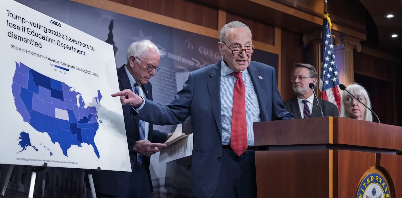 Senate Minority Leader Chuck Schumer and fellow Democrats criticize President Donald Trump’s plan to shutter the Education Department on March 6, 2025. AP Photo/J. Scott Applewhite/File