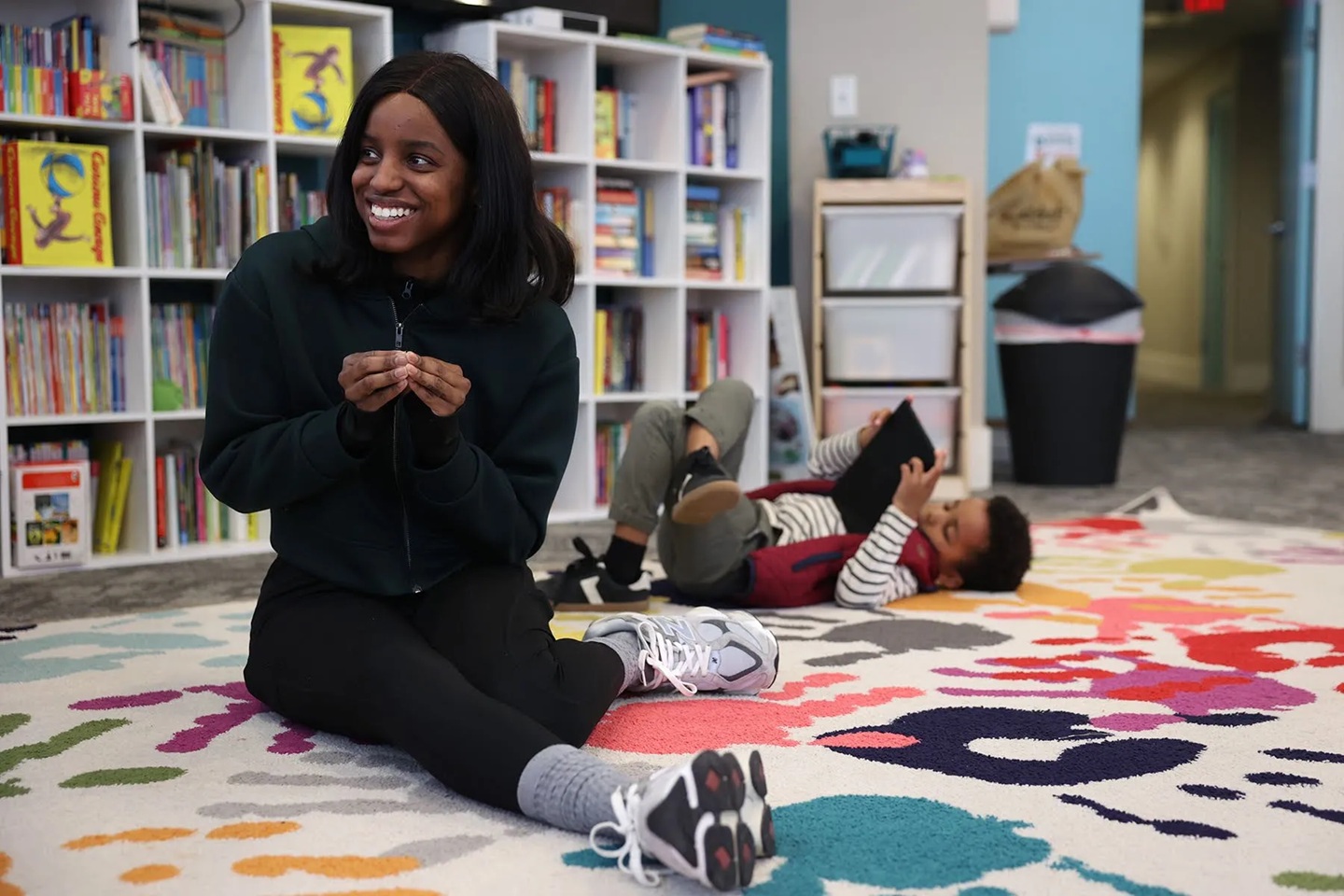 HEARTH resident Qwontajah Myers sits on the floor with her son Jelani Myers, 5, in the community room on Friday, March 28, 2025, at the HEARTH facility. (Photo by Anastasia Busby/PublicSource)