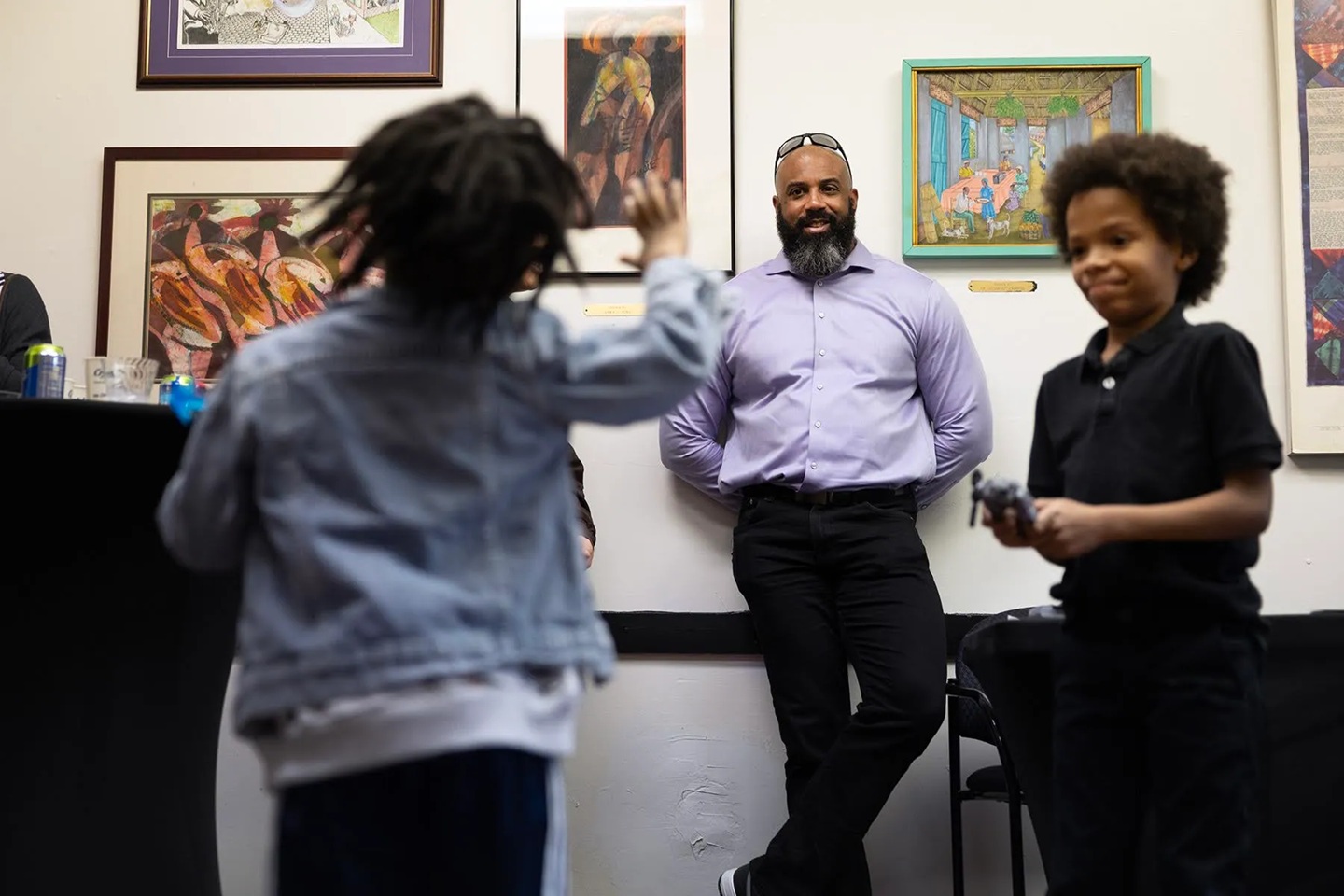 PPS board member Gene Walker watches kids dance at the Black Women for a Better Education’s PPS candidate launch party on Monday, March 10, 2025, at Freedom Unlimited in the Hill District. (Photo by Anastasia Busby/PublicSource)