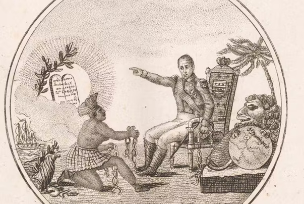 A French propaganda engraving from 1825 depicts King Charles X bestowing freedom on a Black man kneeling before him in chains. ‘S.M. Charles X, le bien-aimé, reconnaissant l’indépendance de St. Domingue,’ 1825, Bibliothèque Nationale de France, Cabinet des Estampes, CC BY-SA