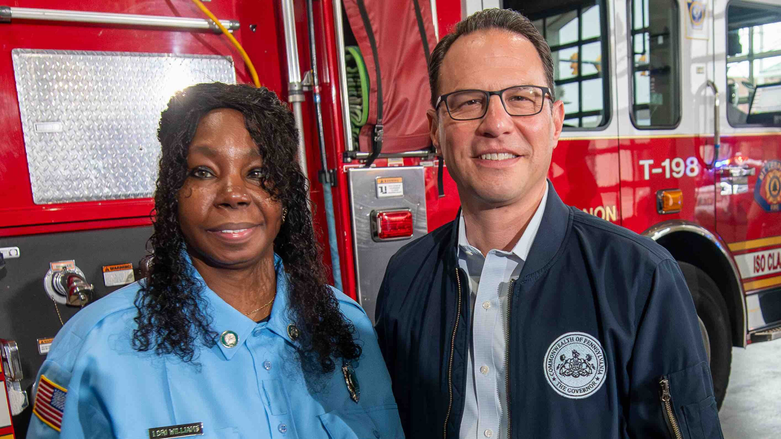 GOV. JOSH SHAPIRO AND FIREFIGHTER LORI WILLIAMS. (PHOTO BY MARLON MARTIN)