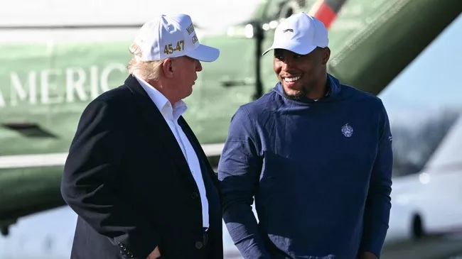 Photos circulating online show Trump and the Eagles star at the president’s golf club in Bedminster, NJ, with multiple “Make America Great Again” hats sitting on the table.