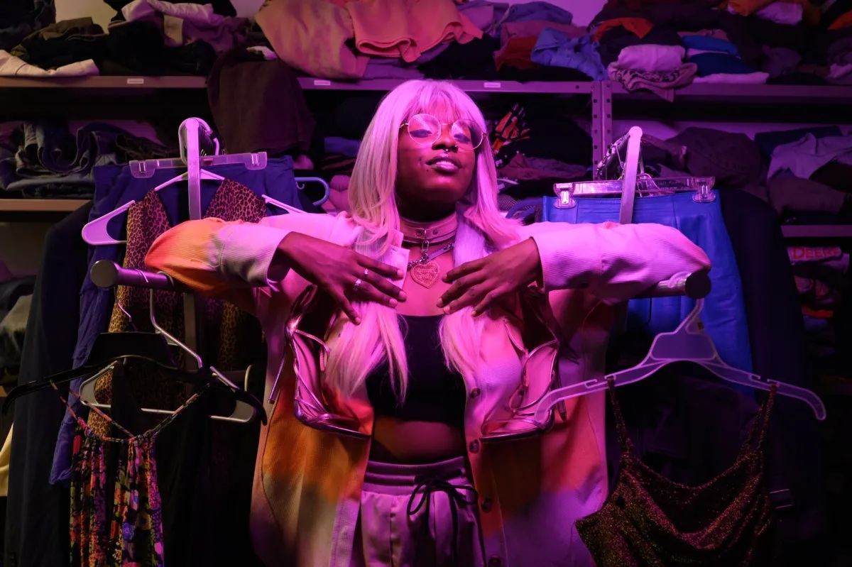 Kitt Night, president of SWOON Alliance, stands with clothes offered in their sex worker mutual aid pop-up closet, Kitt’s Clawset, at the QMNTY Center, Monday, April 7, 2025, in the North Side’s East Allegheny neighborhood. Pittsburgh’s SWOON Alliance [Sex Workers Owning Our Narratives] uses the pop-up clothing swaps to connect sex workers with new and gently used clothes for their work, for transitioning genders, or for transitioning to work outside of the sex industry. (Photo by Stephanie Strasburg/PublicSource)