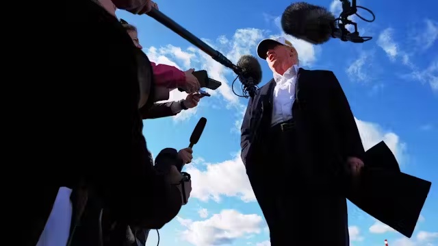 President Donald Trump speaks with reporters before boarding Air Force One in Morristown, N.J., on April 27, 2025. AP Photo/Evan Vucci)