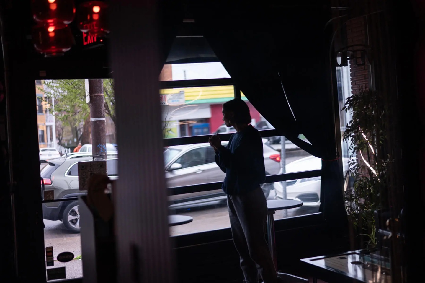 Grace Emmerling, co-owner of the venue and bar Mixtape, looks out to the 4900 block of Penn Avenue from Mixtape’s window in Garfield on Thursday, April 10, 2025. Emmerling lives a few blocks away and Penn construction shook her home in the early mornings. “The cup. The table. It would vibrate from the equipment,” she says. “I barely slept, and it was already starting again.” (Photo by Stephanie Strasburg/PublicSource)