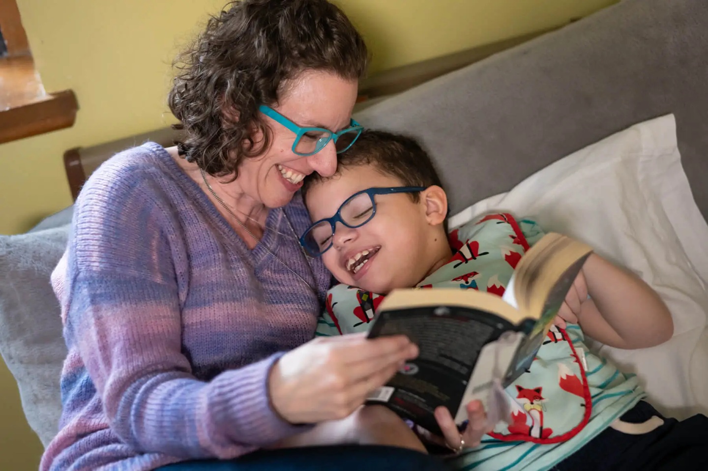 Amy Whipple, left, of Carnegie, cuddles with her son, WD, 10, as they read together at the Sewickley facility where he lives, on Tuesday, April 15, 2025. (Photo by Stephanie Strasburg/PublicSource)